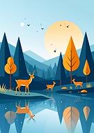 Geometric Deer Landscape with Lake Reflection