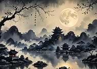 Serene Asian Landscape Under a Full Moon