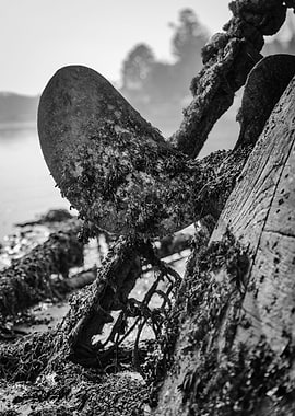 A large, yellow buoy rope washed ashore on a sandy beach. The rope is wrapped around the buoy, which is slightly deflated. The buoy and rope are both weathered and worn, and the buoy has a large hole in it. The beach is littered with other debris, including pieces of plastic and wood. The water is a deep blue color, and the sky is a light blue color. The sun is shining brightly, and the waves are gently lapping at the shore.