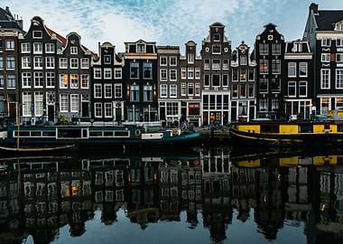 A close-up shot of a rack displaying various postcards featuring scenes of Amsterdam. The postcards showcase different aspects of the city, including canal views, traditional architecture, and iconic landmarks. The postcards are arranged in a grid pattern, with each one featuring the word 'Amsterdam' printed at the top. The price tags on the postcards indicate they are for sale.